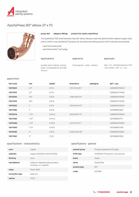 The ApolloPress® 807 Small Diameter Press 90° Elbow features a lead free dezincification resistant copper body and an EPDM o-ring. ApolloPress® products are manufactured utilizing proven ASTM materials and standards.