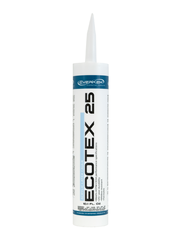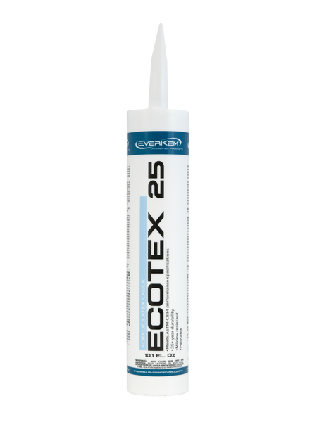 EcoTex 25 Acrylic Latex Caulk is a white, general-purpose caulking material that applies with a smooth consistency and cures to a tough rubbery solid. EcoTex 25 Acrylic Latex Caulk is an economical caulking material that is suitable for multiple interior/exterior applications such as sealing and bonding joints around wood, glass, aluminum, and other surfaces. EcoTex 25 is ideal for use as a filler compound for joints, crack, seams, and holes associated with pre-painting applications for both interior and exterior applications.