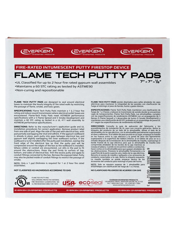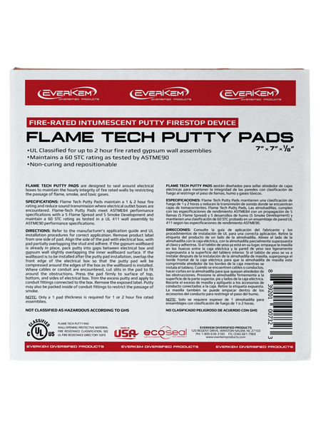 Intumescent Fire-Rated Putty Pads measure 7” x 7” x 1/8” and are engineered to seal electrical boxes, preserving the fire resistance of gypsum walls for up to two hours. UL classified and tested to ASTM-E90 standards, these pads effectively block flame, smoke, and toxic gases while maintaining a 60 STC sound rating. Their non-curing, asbestos-free composition ensures durability and ease of installation, making them a reliable solution for fire-rated wall systems.