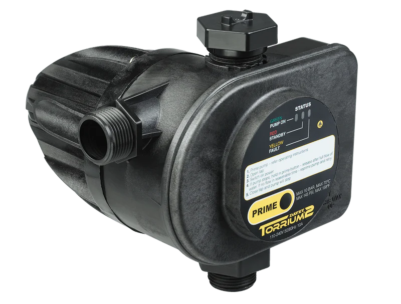 Torrium 2 is an intelligent controller designed to supply pressure boosted water with constant flow and even water pressure to domestic households. It incorporates several levels of pump protection. To give you strong pressure right from the start, this controller is designed to cut in quickly when it senses demand for water. It cuts in when the pressure has dropped to 80% of the previous top (shut-off) pressure. Torrium 2 automatically sets this cut-in pressure each time the pump stops. In doing so, Torrium 2 automatically adapts to variations in pump performance or site conditions.